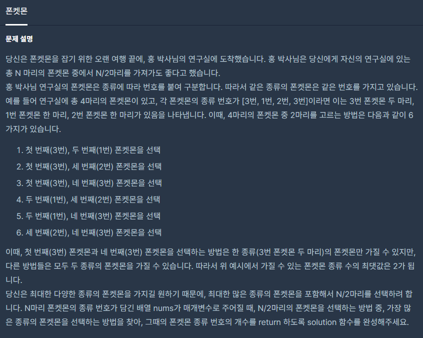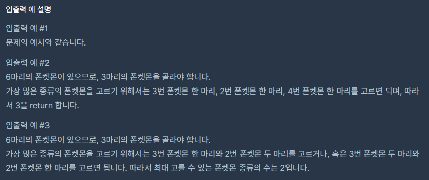 입출력 1을 보시면 [3, 1, 2, 3]입니다. 중복을 없애면 총 3마리의 폰켓몬이 나옵니다. 하지만 홍 박사님은 총 N마리 중에 절반만 가져갈 수 있도록 허락했습니다. 총 4마리의 절반은 2마리, 중복을 없애면 3마리가 나옵니다.
