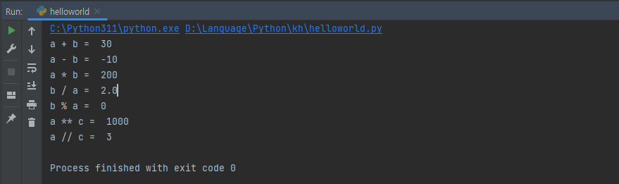 | ** | 제곱 | a ** c = 1000 |