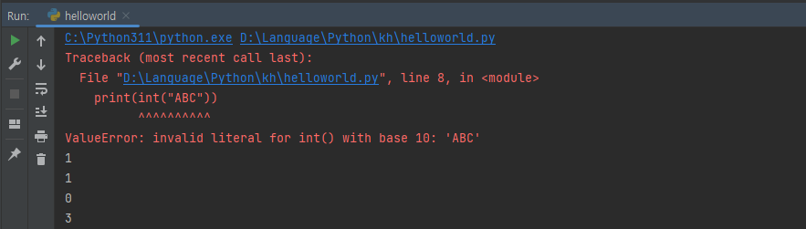 int(string)는 숫자로된 문자열(int("3"))은 타입변환이 가능하지만 영어나 한글로 된 문자열(int("a"))은 타입변환이 불가능합니다.